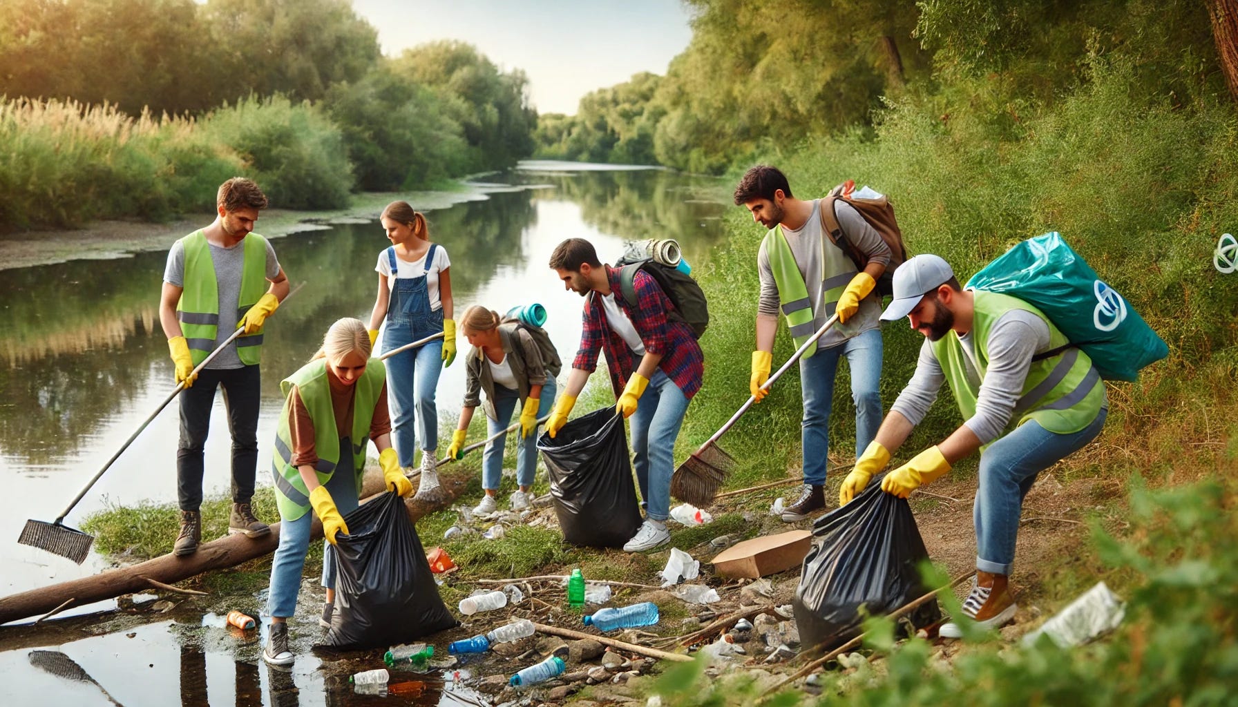 Image: volunteer workers collecting and bagging trash for recycling (ChatGPT)